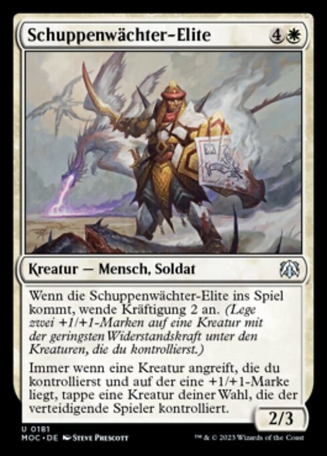 | Rules | When Elite Scaleguard enters the battlefield, bolster 2. (Choose a creature with the least toughness among creatures you control and put two +1/+1 counters on it.) Whenever a creature you control with a +1/+1 counter on it attacks, tap target creature defending player controls. |