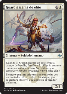 | Rules | When Elite Scaleguard enters the battlefield, bolster 2. (Choose a creature with the least toughness among creatures you control and put two +1/+1 counters on it.) Whenever a creature you control with a +1/+1 counter on it attacks, tap target creature defending player controls. |