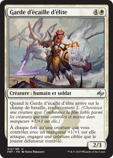 | Rules | When Elite Scaleguard enters the battlefield, bolster 2. (Choose a creature with the least toughness among creatures you control and put two +1/+1 counters on it.) Whenever a creature you control with a +1/+1 counter on it attacks, tap target creature defending player controls. |