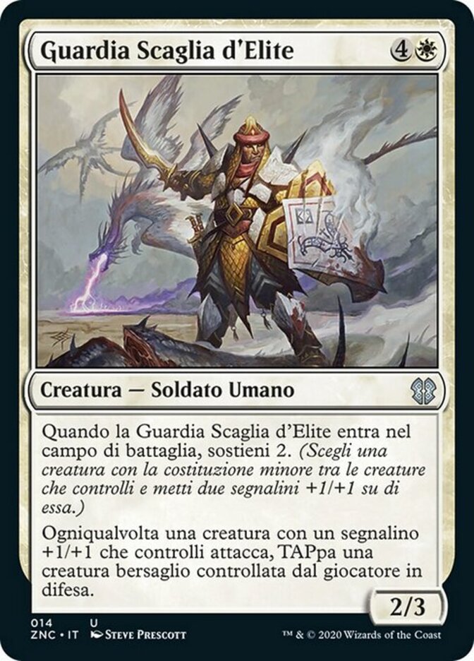 | Rules | When Elite Scaleguard enters the battlefield, bolster 2. (Choose a creature with the least toughness among creatures you control and put two +1/+1 counters on it.) Whenever a creature you control with a +1/+1 counter on it attacks, tap target creature defending player controls. |