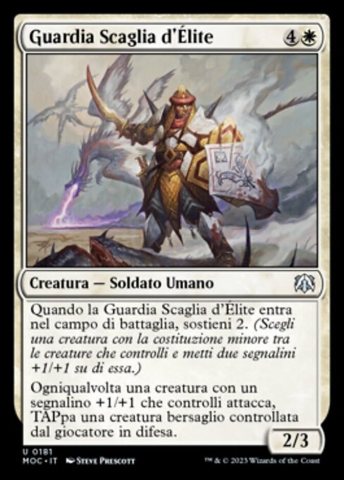 | Rules | When Elite Scaleguard enters the battlefield, bolster 2. (Choose a creature with the least toughness among creatures you control and put two +1/+1 counters on it.) Whenever a creature you control with a +1/+1 counter on it attacks, tap target creature defending player controls. |
