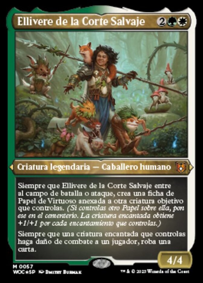 | Rules | Whenever Ellivere of the Wild Court enters the battlefield or attacks, create a Virtuous Role token attached to another target creature you control. (If you control another Role on it, put that one into the graveyard. Enchanted creature gets +1/+1 for each enchantment you control.) Whenever an enchanted creature you control deals combat damage to a player, draw a card. |