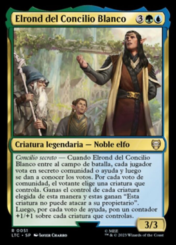 | Rules | Secret council — When Elrond of the White Council enters the battlefield, each player secretly votes for fellowship or aid, then those votes are revealed. For each fellowship vote, the voter chooses a creature they control. You gain control of each creature chosen this way, and they gain "This creature can't attack its owner." Then for each aid vote, put a +1/+1 counter on each creature you control. |
