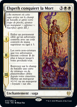 | Rules | (As this Saga enters and after your draw step, add a lore counter. Sacrifice after III.) I — Exile target permanent an opponent controls with mana value 3 or greater. II — Noncreature spells your opponents cast cost more to cast until your next turn. III — Return target creature or planeswalker card from your graveyard to the battlefield. Put a +1/+1 counter or a loyalty counter on it. |