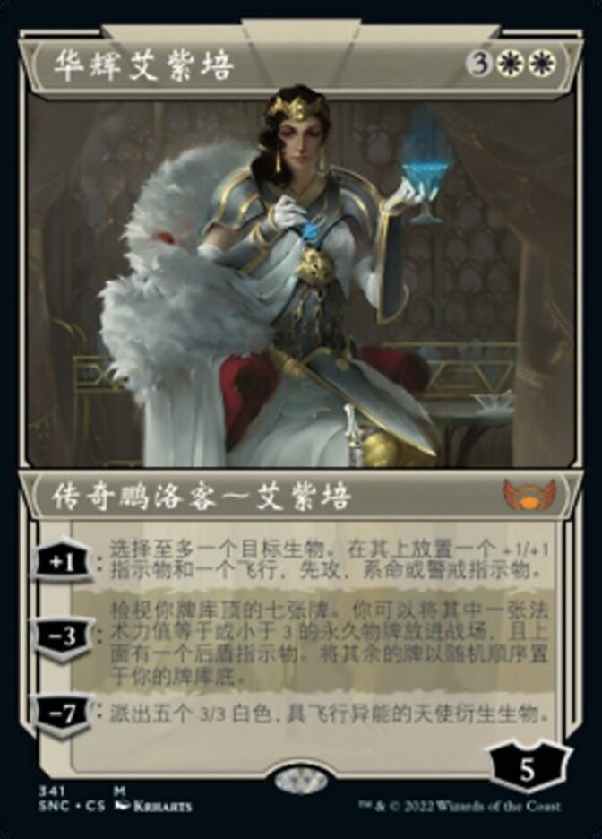 | Rules | +1: Choose up to one target creature. Put a +1/+1 counter and a counter from among flying, first strike, lifelink, or vigilance on it. −3: Look at the top seven cards of your library. You may put a permanent card with mana value 3 or less from among them onto the battlefield with a shield counter on it. Put the rest on the bottom of your library in a random order. −7: Create five 3/3 white Angel creature tokens with flying. |