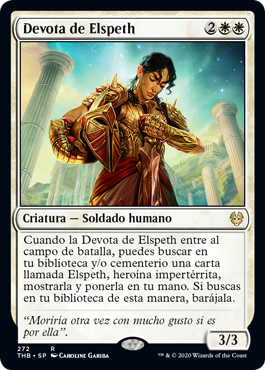 | Rules | When Elspeth's Devotee enters the battlefield, you may search your library and/or graveyard for a card named Elspeth, Undaunted Hero, reveal it, and put it into your hand. If you search your library this way, shuffle. |