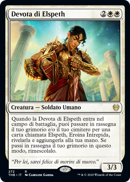 Rules When Elspeth's Devotee enters the battlefield, you may search your library and/or graveyard for a card named Elspeth, Undaunted Hero, reveal it, and put it into your hand. If you search your library this way, shuffle.