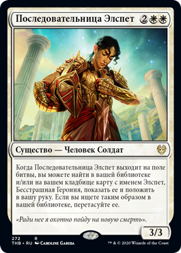 | Rules | When Elspeth's Devotee enters the battlefield, you may search your library and/or graveyard for a card named Elspeth, Undaunted Hero, reveal it, and put it into your hand. If you search your library this way, shuffle. |