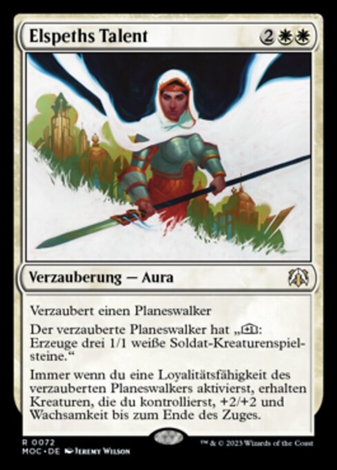 | Rules | Enchant planeswalker Enchanted planeswalker has "[+1]: Create three 1/1 white Soldier creature tokens." Whenever you activate a loyalty ability of enchanted planeswalker, creatures you control get +2/+2 and gain vigilance until end of turn. |