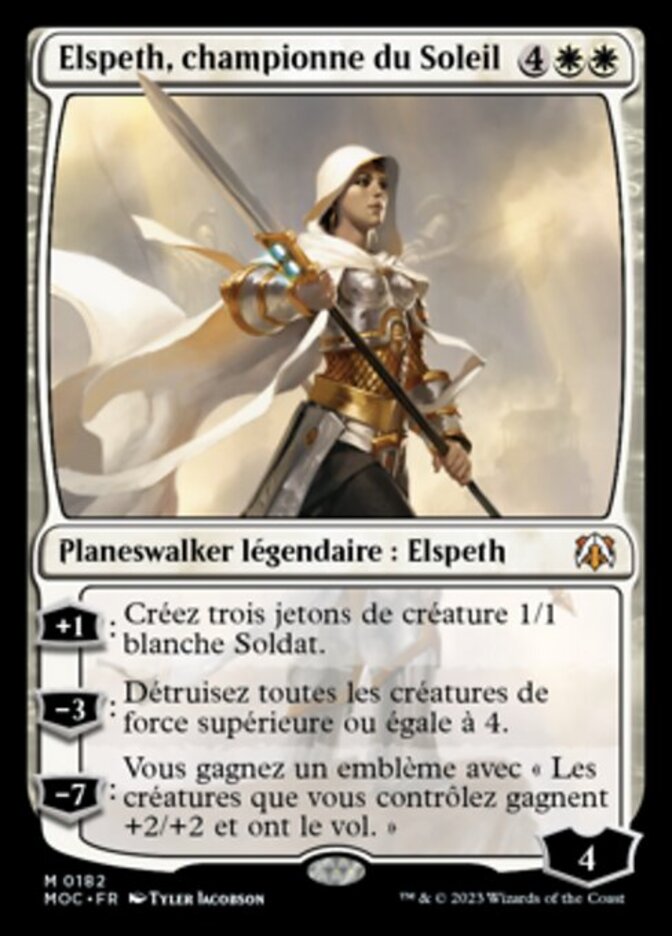| Rules | +1: Create three 1/1 white Soldier creature tokens. −3: Destroy all creatures with power 4 or greater. −7: You get an emblem with "Creatures you control get +2/+2 and have flying." |