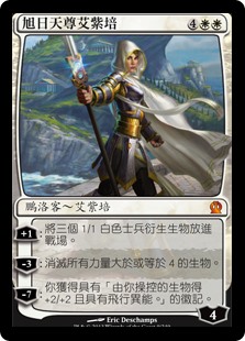 | Rules | +1: Create three 1/1 white Soldier creature tokens. −3: Destroy all creatures with power 4 or greater. −7: You get an emblem with "Creatures you control get +2/+2 and have flying." |