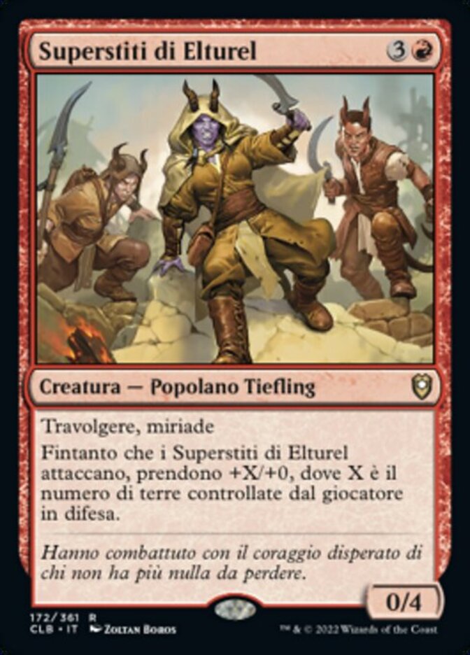 | Rules | Trample, myriad As long as Elturel Survivors is attacking, it gets +X/+0, where X is the number of lands defending player controls. |