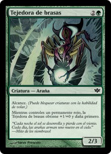 | Rules | Reach (This creature can block creatures with flying.) As long as you control a red permanent, Ember Weaver gets +1/+0 and has first strike. |
