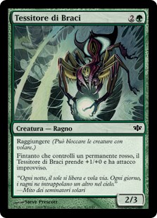 | Rules | Reach (This creature can block creatures with flying.) As long as you control a red permanent, Ember Weaver gets +1/+0 and has first strike. |