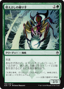 | Rules | Reach (This creature can block creatures with flying.) As long as you control a red permanent, Ember Weaver gets +1/+0 and has first strike. |