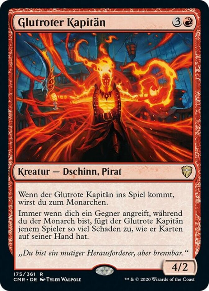 | Rules | When Emberwilde Captain enters the battlefield, you become the monarch. Whenever an opponent attacks you while you're the monarch, Emberwilde Captain deals damage to that player equal to the number of cards in their hand. |