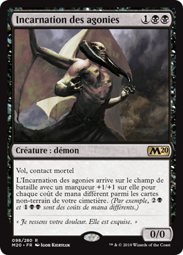 | Rules | Flying, deathtouch Embodiment of Agonies enters the battlefield with a +1/+1 counter on it for each different mana cost among nonland cards in your graveyard. (For example, and are different mana costs.) |
