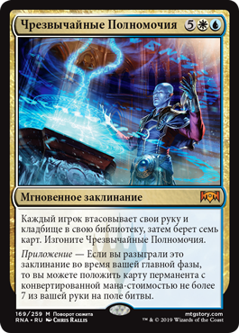 | Rules | Each player shuffles their hand and graveyard into their library, then draws seven cards. Exile Emergency Powers. Addendum — If you cast this spell during your main phase, you may put a permanent card with mana value 7 or less from your hand onto the battlefield. |
