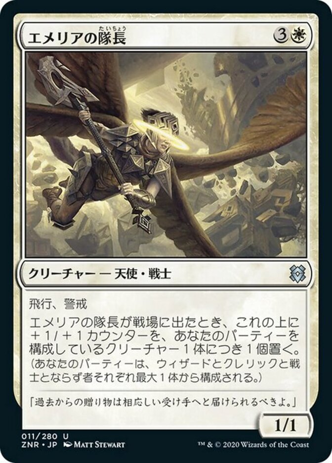 | Rules | Flying, vigilance When Emeria Captain enters the battlefield, put a +1/+1 counter on it for each creature in your party. (Your party consists of up to one each of Cleric, Rogue, Warrior, and Wizard.) |