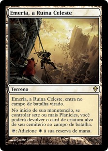 | Rules | Emeria, the Sky Ruin enters the battlefield tapped. At the beginning of your upkeep, if you control seven or more Plains, you may return target creature card from your graveyard to the battlefield. : Add . |