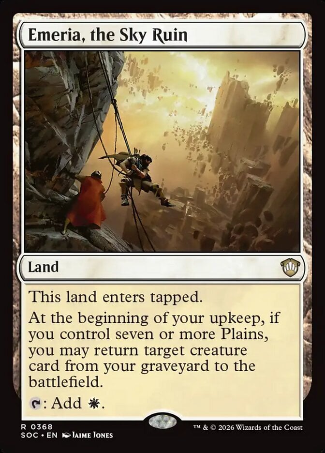 | Rules | Emeria, the Sky Ruin enters the battlefield tapped. At the beginning of your upkeep, if you control seven or more Plains, you may return target creature card from your graveyard to the battlefield. : Add . |