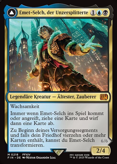 | Rules | Vigilance Whenever Emet-Selch enters or attacks, draw a card, then discard a card. At the beginning of your upkeep, if there are fourteen or more cards in your graveyard, you may transform Emet-Selch. // Vigilance Echo of the Lost — During your turn, you may play cards from your graveyard. If a card or token would be put into your graveyard from anywhere, exile it instead. |