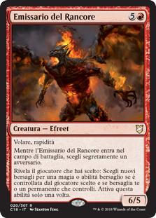 | Rules | Flying, haste As Emissary of Grudges enters the battlefield, secretly choose an opponent. Reveal the player you chose: Choose new targets for target spell or ability if it's controlled by the chosen player and if it targets you or a permanent you control. Activate only once. |