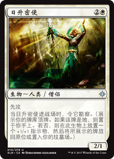 | Rules | First strike When Emissary of Sunrise enters the battlefield, it explores. (Reveal the top card of your library. Put that card into your hand if it's a land. Otherwise, put a +1/+1 counter on this creature, then put the card back or put it into your graveyard.) |