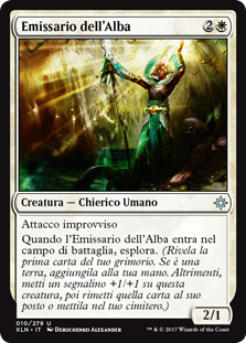 | Rules | First strike When Emissary of Sunrise enters the battlefield, it explores. (Reveal the top card of your library. Put that card into your hand if it's a land. Otherwise, put a +1/+1 counter on this creature, then put the card back or put it into your graveyard.) |