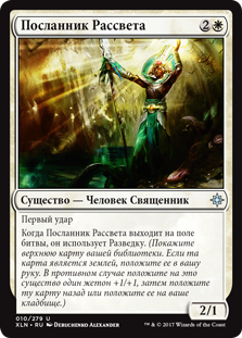 | Rules | First strike When Emissary of Sunrise enters the battlefield, it explores. (Reveal the top card of your library. Put that card into your hand if it's a land. Otherwise, put a +1/+1 counter on this creature, then put the card back or put it into your graveyard.) |