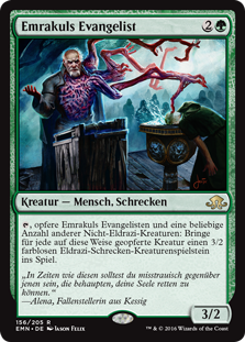 | Rules | , Sacrifice Emrakul's Evangel and any number of other non-Eldrazi creatures: Create a 3/2 colorless Eldrazi Horror creature token for each creature sacrificed this way. |
