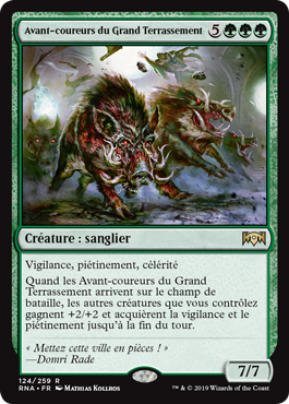 | Rules | Vigilance, trample, haste When End-Raze Forerunners enters the battlefield, other creatures you control get +2/+2 and gain vigilance and trample until end of turn. |
