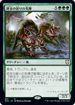 | Rules | Vigilance, trample, haste When End-Raze Forerunners enters the battlefield, other creatures you control get +2/+2 and gain vigilance and trample until end of turn. |
