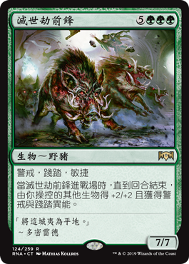 | Rules | Vigilance, trample, haste When End-Raze Forerunners enters the battlefield, other creatures you control get +2/+2 and gain vigilance and trample until end of turn. |