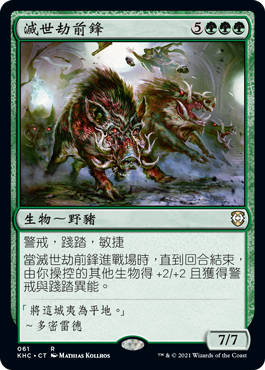 | Rules | Vigilance, trample, haste When End-Raze Forerunners enters the battlefield, other creatures you control get +2/+2 and gain vigilance and trample until end of turn. |