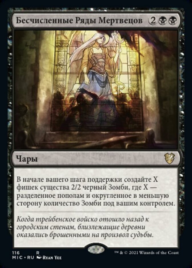 | Rules | At the beginning of your upkeep, create X 2/2 black Zombie creature tokens, where X is half the number of Zombies you control, rounded down. |