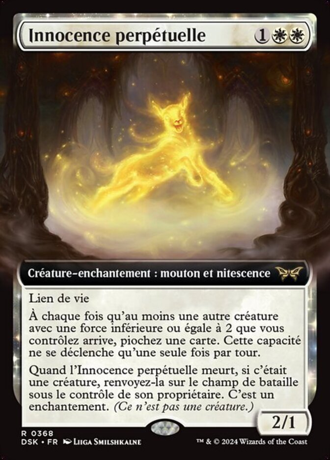 | Rules | Lifelink Whenever one or more other creatures you control with power 2 or less enter, draw a card. This ability triggers only once each turn. When Enduring Innocence dies, if it was a creature, return it to the battlefield under its owner's control. It's an enchantment. (It's not a creature.) |