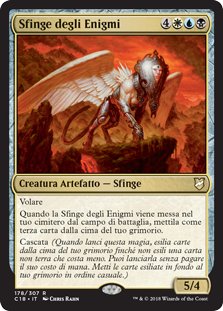 | Rules | Flying When Enigma Sphinx is put into your graveyard from the battlefield, put it into your library third from the top. Cascade (When you cast this spell, exile cards from the top of your library until you exile a nonland card that costs less. You may cast it without paying its mana cost. Put the exiled cards on the bottom of your library in a random order.) |