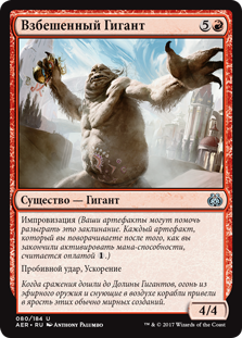 | Rules | Improvise (Your artifacts can help cast this spell. Each artifact you tap after you're done activating mana abilities pays for .) Trample, haste |