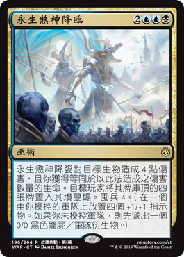 | Rules | Enter the God-Eternals deals 4 damage to target creature and you gain life equal to the damage dealt this way. Target player mills four cards. Amass 4. (Put four +1/+1 counters on an Army you control. If you don't control one, create a 0/0 black Zombie Army creature token first.) |