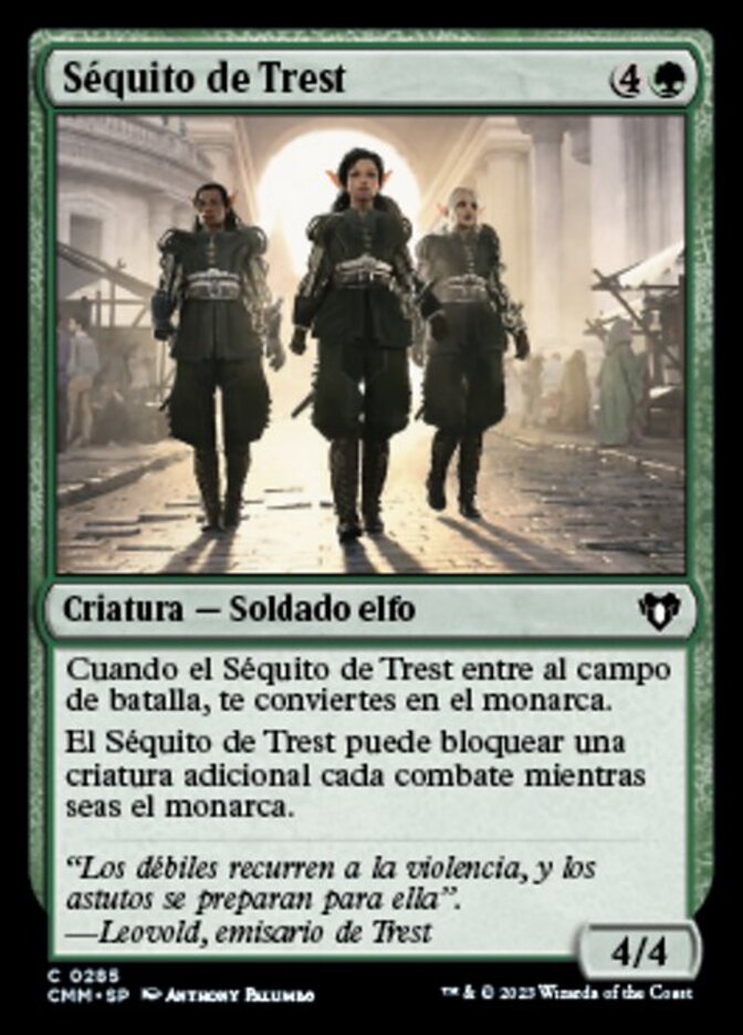 | Rules | When Entourage of Trest enters the battlefield, you become the monarch. Entourage of Trest can block an additional creature each combat as long as you're the monarch. |