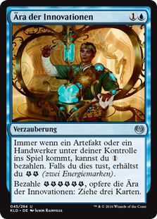 | Rules | Whenever an artifact or Artificer enters the battlefield under your control, you may pay . If you do, you get (two energy counters). Pay , Sacrifice Era of Innovation: Draw three cards. |