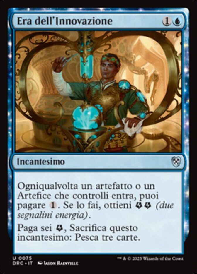 | Rules | Whenever an artifact or Artificer enters the battlefield under your control, you may pay . If you do, you get (two energy counters). Pay , Sacrifice Era of Innovation: Draw three cards. |