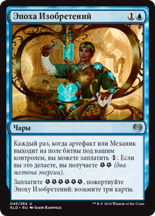 | Rules | Whenever an artifact or Artificer enters the battlefield under your control, you may pay . If you do, you get (two energy counters). Pay , Sacrifice Era of Innovation: Draw three cards. |