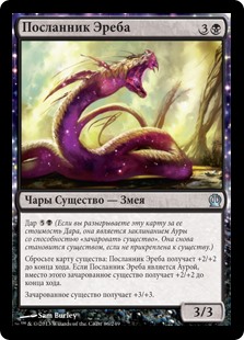 | Rules | Bestow (If you cast this card for its bestow cost, it's an Aura spell with enchant creature. It becomes a creature again if it's not attached to a creature.) Discard a creature card: Erebos's Emissary gets +2/+2 until end of turn. If Erebos's Emissary is an Aura, enchanted creature gets +2/+2 until end of turn instead. Enchanted creature gets +3/+3. |