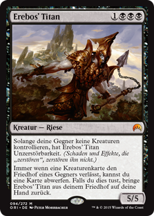 | Rules | As long as your opponents control no creatures, Erebos's Titan has indestructible. (Damage and effects that say "destroy" don't destroy it.) Whenever a creature card leaves an opponent's graveyard, you may discard a card. If you do, return Erebos's Titan from your graveyard to your hand. |