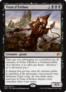 | Rules | As long as your opponents control no creatures, Erebos's Titan has indestructible. (Damage and effects that say "destroy" don't destroy it.) Whenever a creature card leaves an opponent's graveyard, you may discard a card. If you do, return Erebos's Titan from your graveyard to your hand. |
