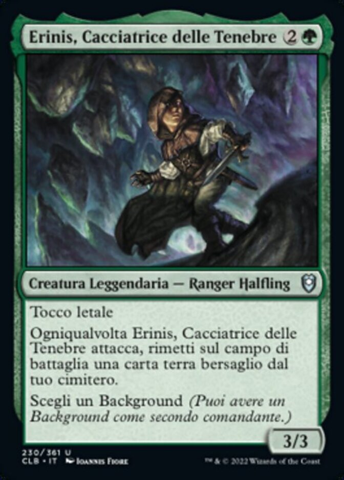 | Rules | Deathtouch Whenever Erinis, Gloom Stalker attacks, return target land card from your graveyard to the battlefield. Choose a Background (You can have a Background as a second commander.) |