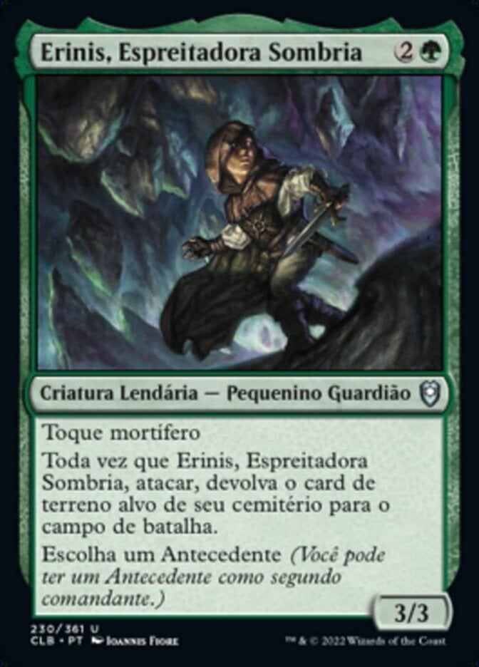 | Rules | Deathtouch Whenever Erinis, Gloom Stalker attacks, return target land card from your graveyard to the battlefield. Choose a Background (You can have a Background as a second commander.) |