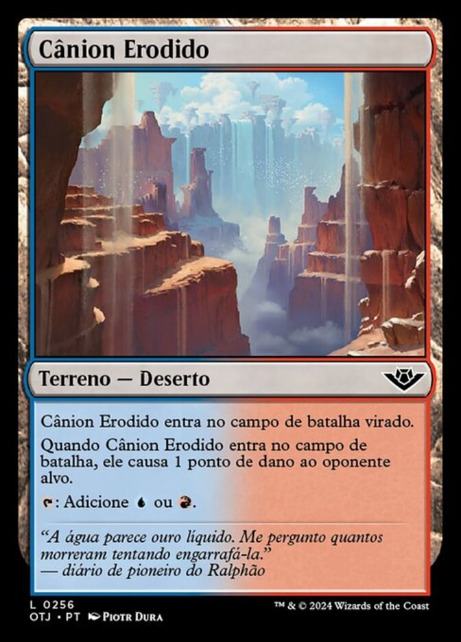 | Rules | Eroded Canyon enters the battlefield tapped. When Eroded Canyon enters the battlefield, it deals 1 damage to target opponent. : Add or . |
